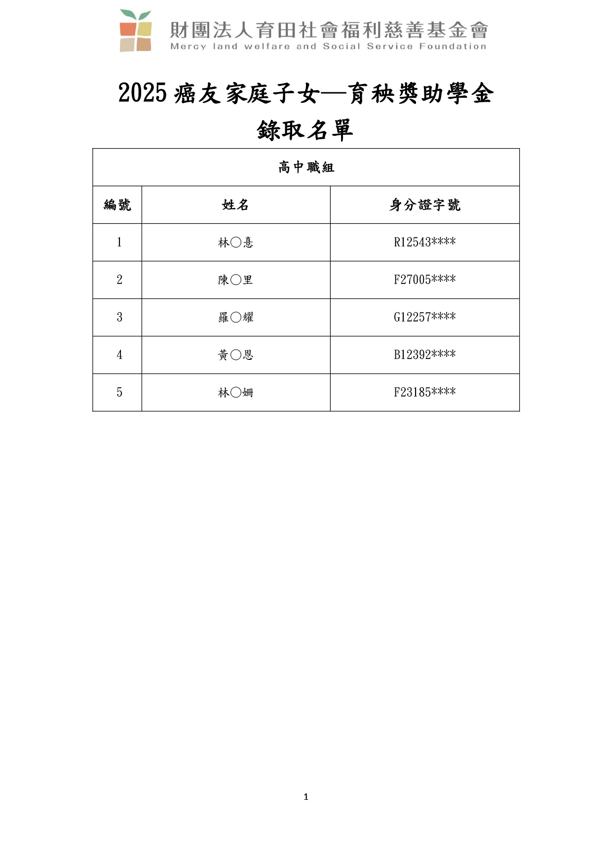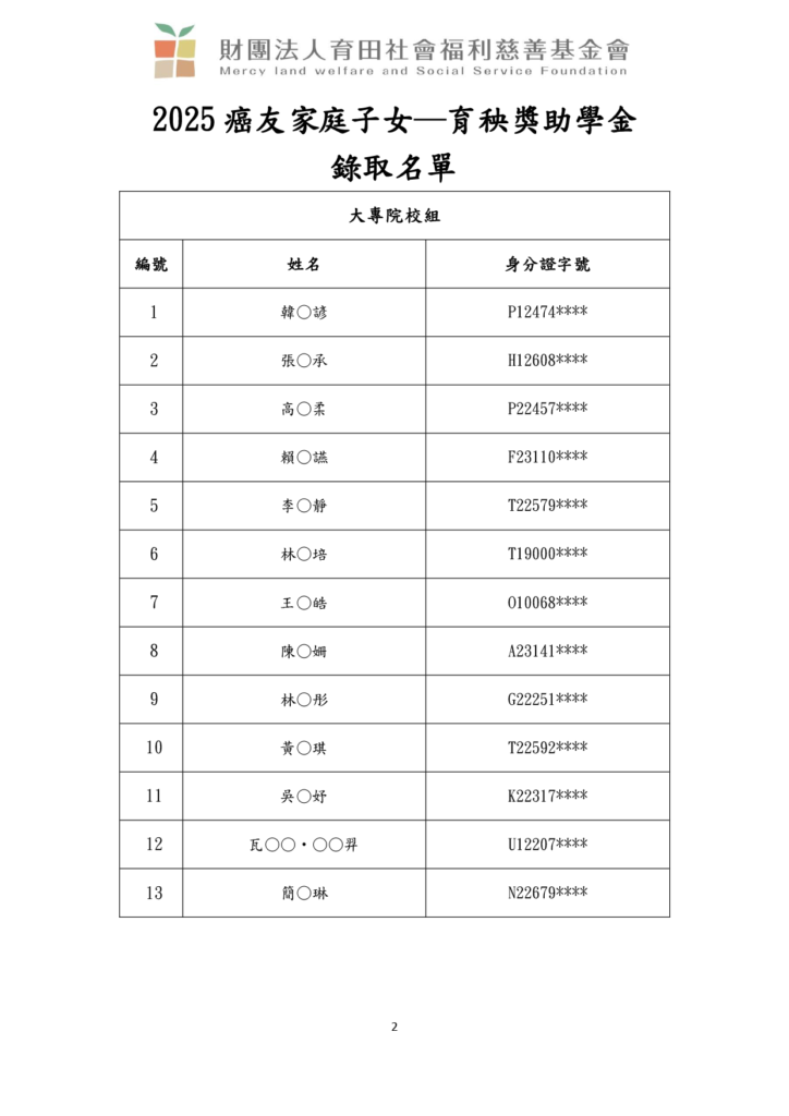 2025 癌友家庭子女—育秧獎助學金 獲獎名單與領取須知