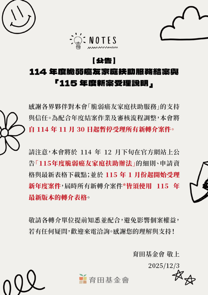 請注意,本會將於 114 年 12 月下旬在官方網站上公告「115年度脆弱癌友家庭扶助辦法」的細則、申請資格與最新表格下載點;並於 115 年 1 月份起開始受理新年度案件,屆時所有新轉介案件*皆須使用 115 年最新版本的轉介表格。