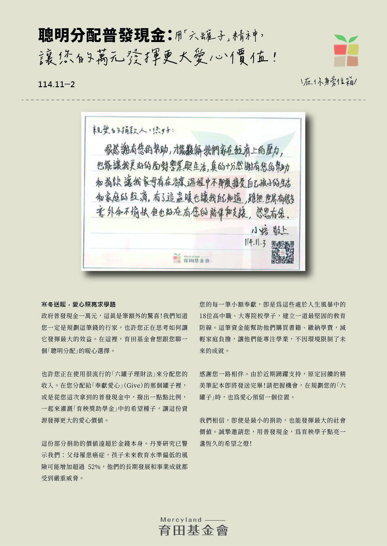 是我們對於每一位捐款人涓滴灌溉的珍惜以及對服務推展的期許