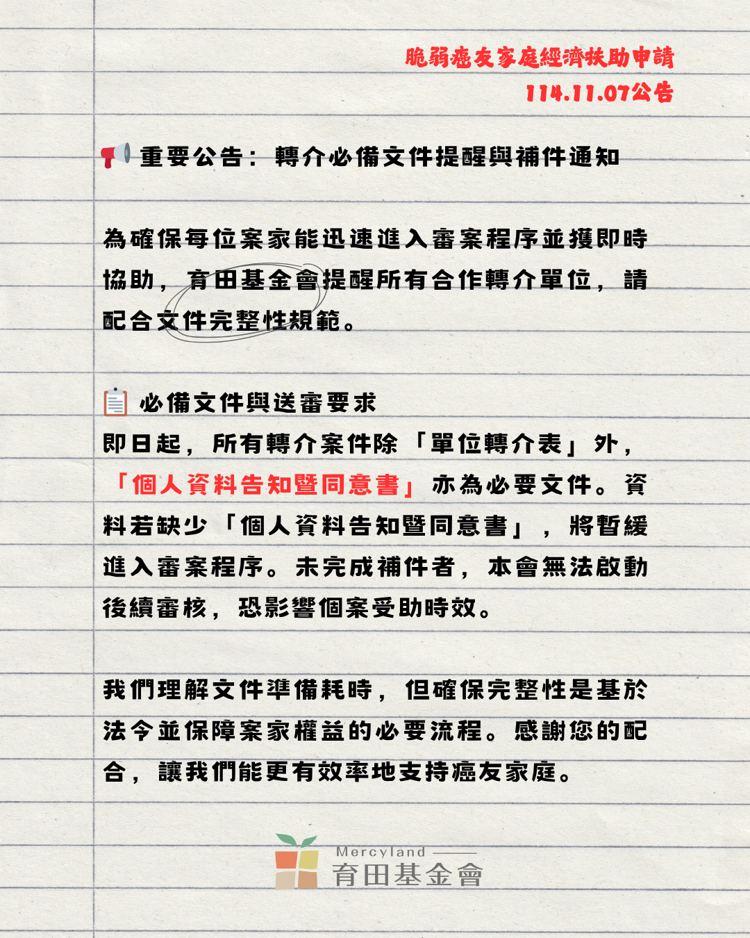 2025-11-072025-11-07 Mercyland 📢 重要公告:轉介必備文件提醒與補件通知 為確保每位案家能迅速進入審案程序並獲即時協助,育田基金會提醒所有合作轉介單位,請配合文件完整性規範。 📋 必備文件與送審要求 即日起,所有轉介案件除「單位轉介表」外,「個人資料告知暨同意書」亦為必要文件。資料若缺少「個人資料告知暨同意書」,將暫緩進入審案程序。未完成補件者,本會無法啟動後續審核,恐影響個案受助時效。 我們理解文件準備耗時,但確保完整性是基於法令並保障案家權益的必要流程。感謝您的配合,讓我們能更有效率地支持癌友家庭。 Post navigation ← 📌【2025癌友家庭子女─育秧獎助學金-錄取名單】